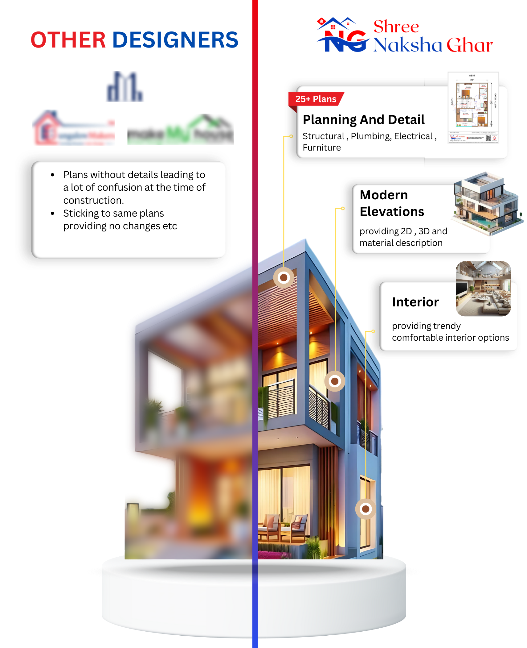 We are experts in developing plans, house elevations, and interior design that suit your plot size comfort, and preferred designs. We aim to deliver designs that satisfy you and contain details that help your developer get to the point of data.